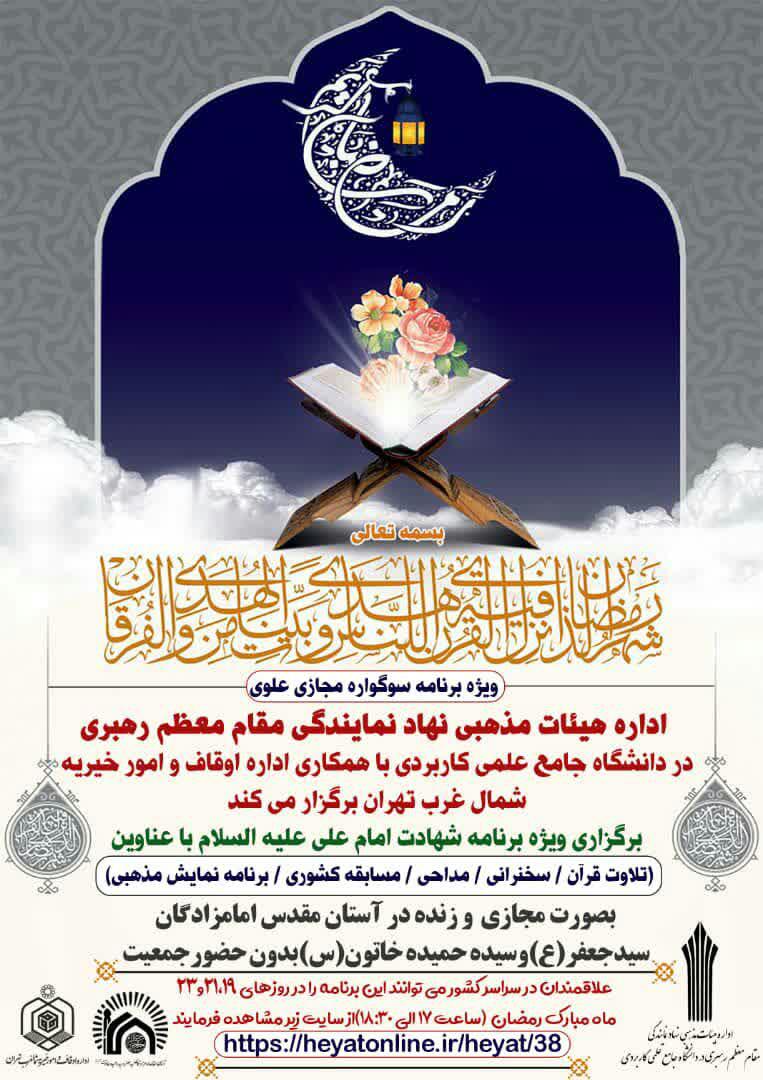به گزارش دفتر نهاد دانشگاه، مدیرهیئات مذهبی دانشگاه جامع علمی کاربردی، از برگزاری مراسم عزاداری در ایام شهادت حضرت علی علیه السلام خبر داد. خسروان ضمن تأکید بر گرامیداشت این ایام و همچنین پیشگیری از شیوع ویروس کرونا خاطر نشان کرد: این مراسم بصورت مجازی و در آستان مقدس امامزاده سید جعفر و سیده حمیده خاتون سلام الله علیها، با همکاری اداره اوقاف و امور خیریه شمال غرب تهران برگزار خواهد شد. وی در پایان خاطر نشان کرد: مدت اجرای برنامه 75 دقیقه وعناوین آن شامل تلاوت قرآن/ سخنرانی/ مداحی/ مسابقه /نمایش شبیه خوانی علوی می باشد که کلیه اساتید، دانشجویان، کارکنان دانشگاه و سایر علاقمندان می توانند این برنامه را از طریق سایت https://heyatonline.ir/heyat/38 از ساعت 17 در روزهای 24-26-28 اردیبهشت مشاهده کنند.