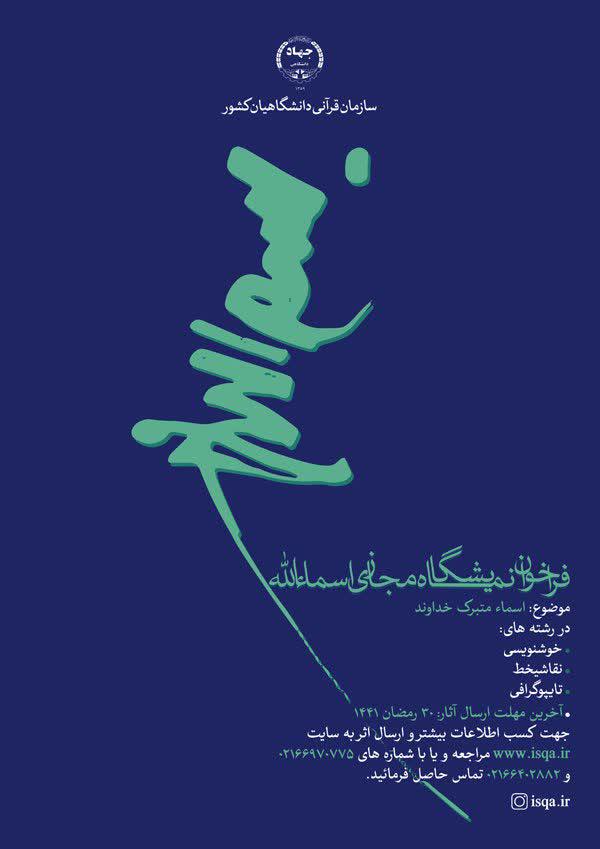 با توجه به شیوع بیماری کرونا و تعطیلی نگارخانه های کشو، سازمان قرآنی دانشگاهیان کشور وابسته به جهاد دانشگاهی فراخوان نمایشگاه خوشنویسی، نقاشی خط و تایپوگرافی با عنوان اسماءالله را اعلام می کند.